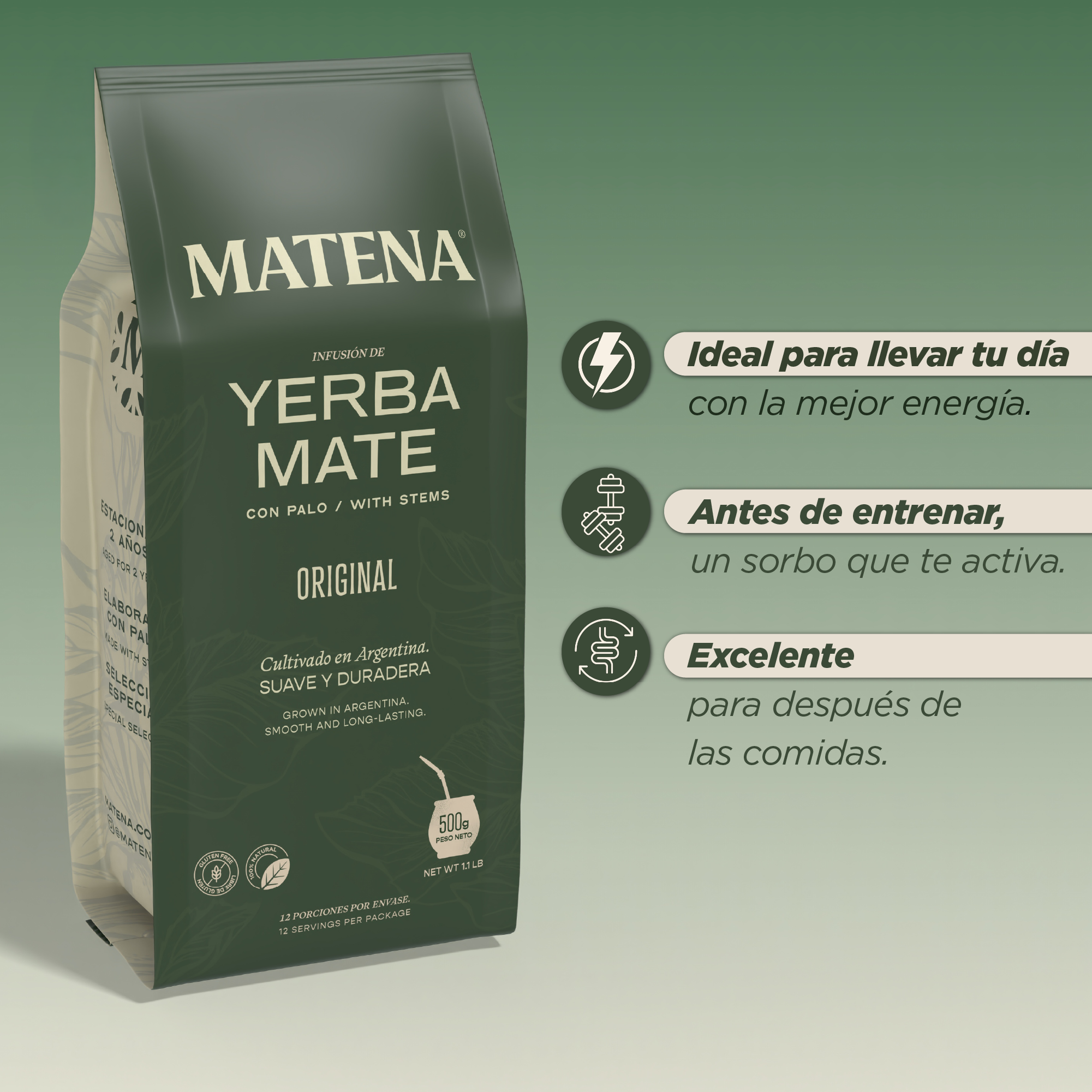 Energía sin ansiedad — La yerba mate tiene cafeína natural que te activa de forma gradual, sin los nervios ni el crash del café.